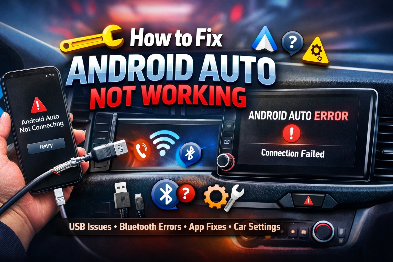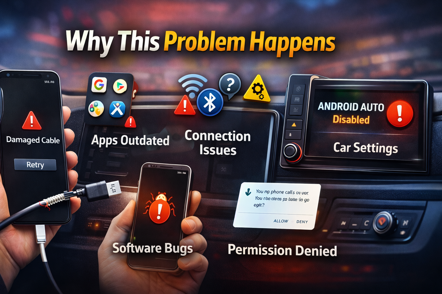 The most common reasons are a faulty USB cable, outdated apps, Bluetooth issues, or disabled Android Auto settings in the car.