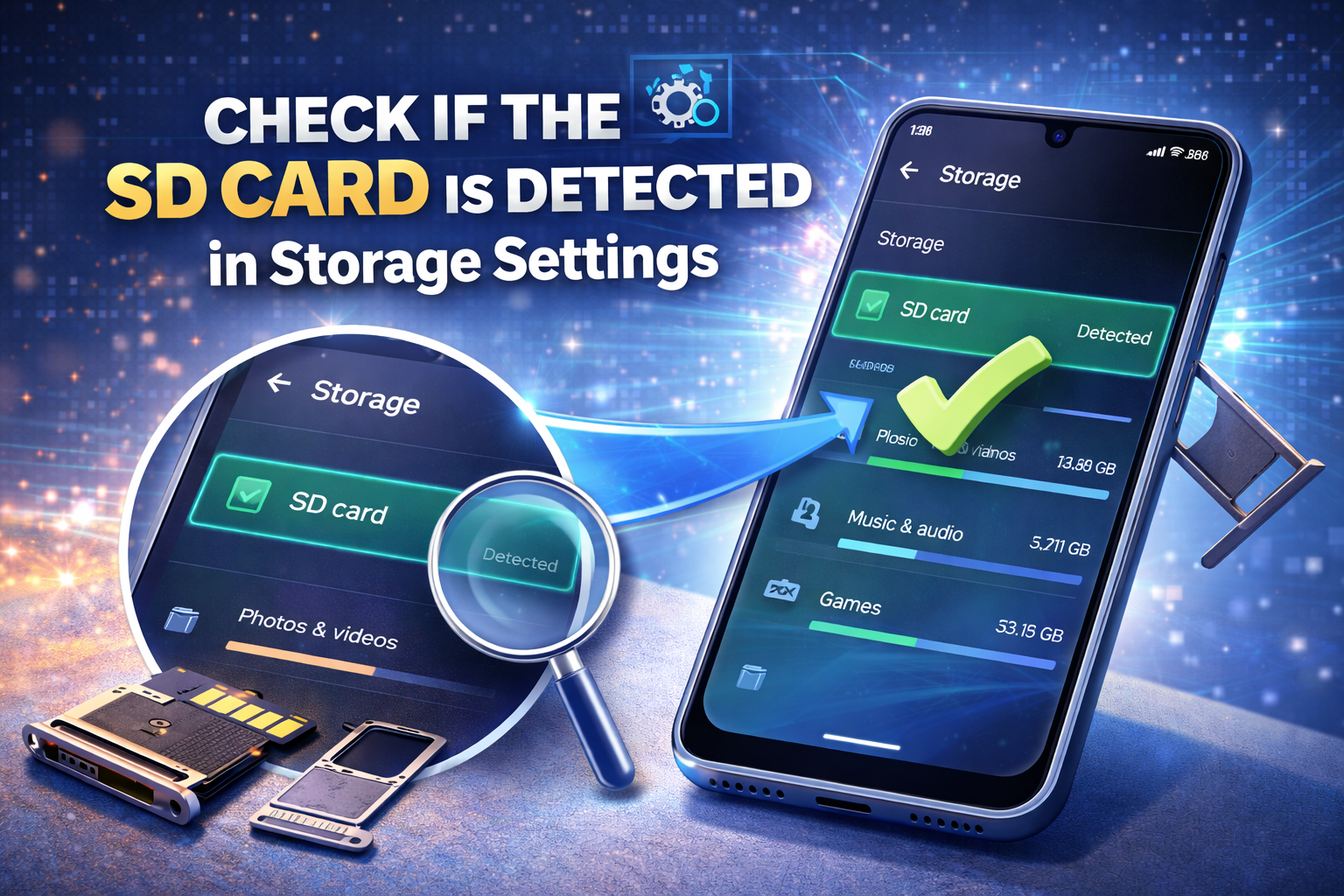 - Check whether the SD card appears in Settings > Storage or in your file manager.