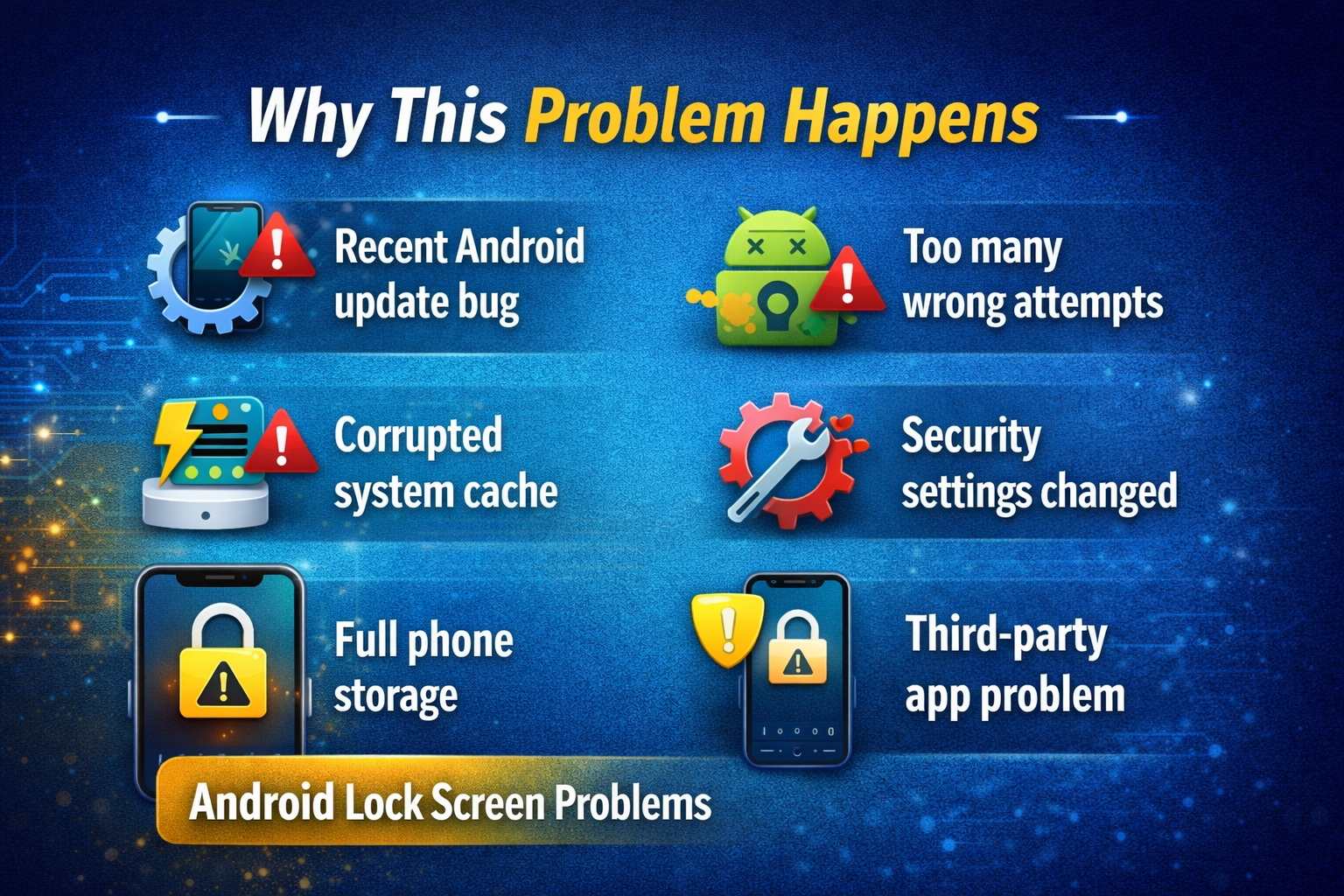 Before jumping into the fixes, it helps to understand the cause. Android lock screen issues often happen for one of these reasons: