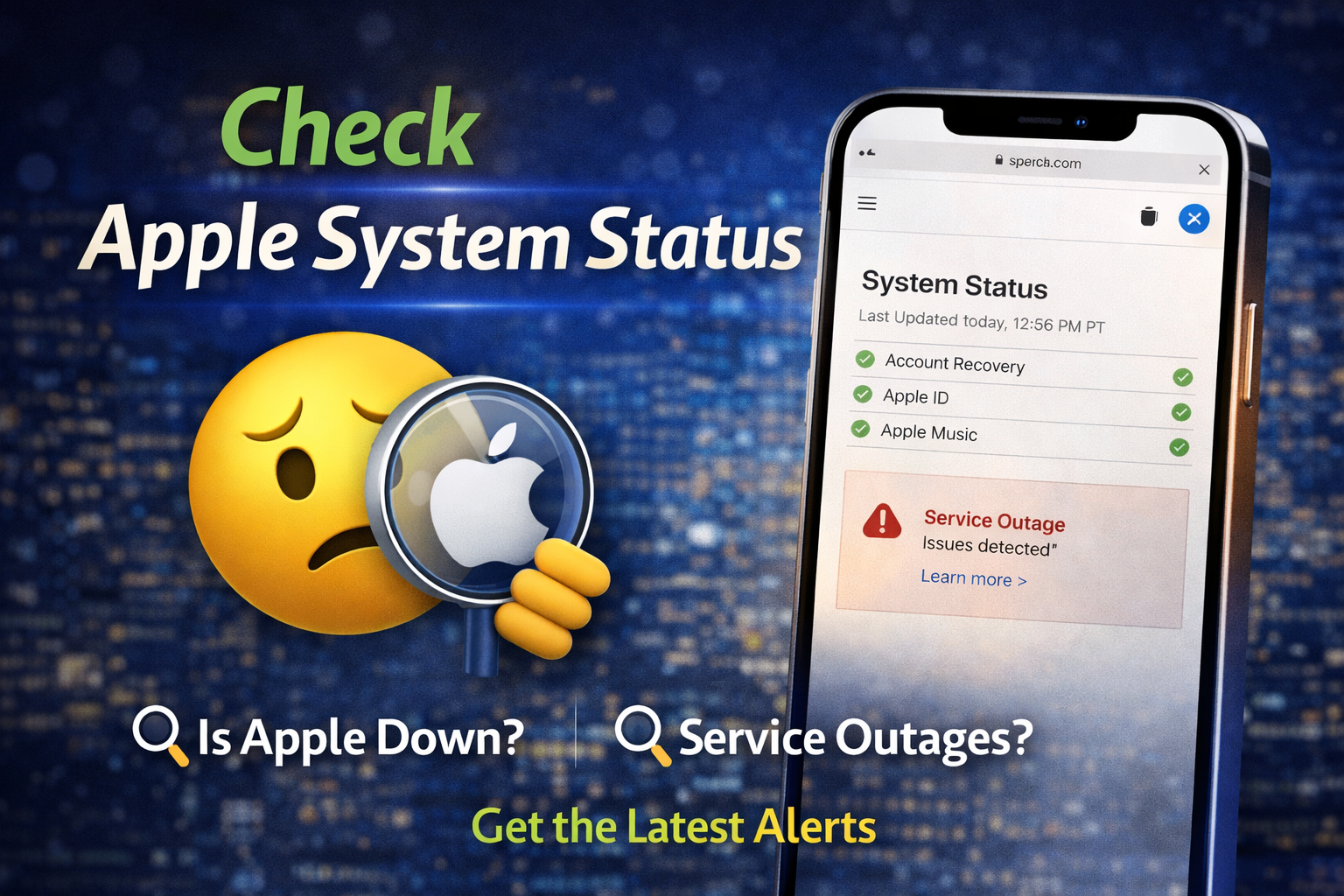 - Visit Apple System Status (search online)
